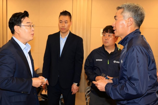 장현국 당시 위메이드 대표이사가 2023년 5월19일 코인게이트 진상조사단 위메이드 현장방문에서 김성원 코인게이트 진상조사단장 국민의힘 의원과 인사를 나누고 있다. <연합뉴스>
