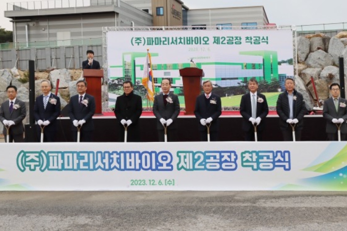 정상수 파마리서치 이사회 의장(가운데)이 2023년 12월6일 강릉과학일반산업단지에서 열린 파마리서치바이오 제2공장 착공식에서 기념촬영하고 있다. <파마리서치바이오>