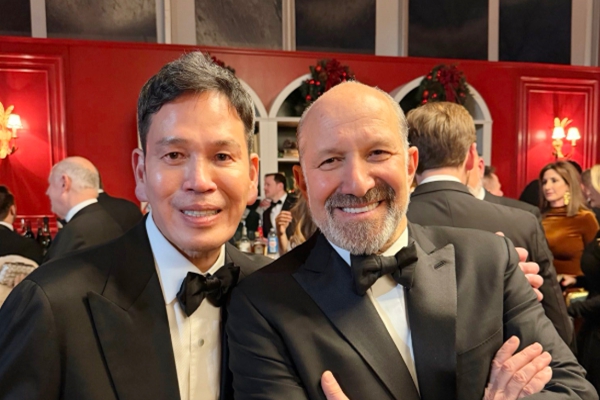 정용진 신세계그룹 회장(왼쪽)과 하워드 러트닉 미국 상무부 장관(오른쪽)이 12일(현지시각) 밴스 부통령의 관저에서 열린 크리스마스 행사에서 만나 사진을 찍고 있다. <신세계그룹>